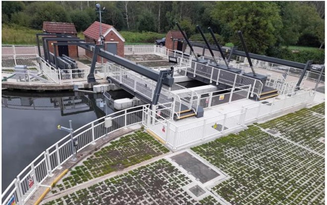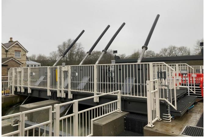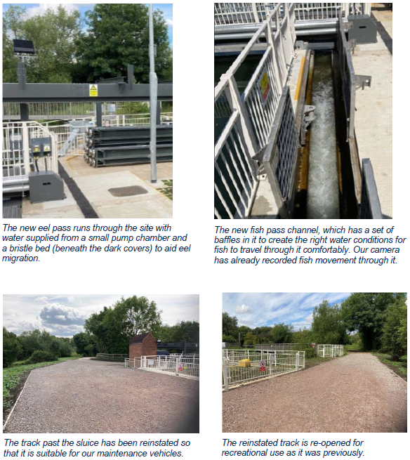 The finished replacement works include two new tilting weir gates, a new bridge with the gate drive mechanisms on it, a new maintenance access bridge at the upstream end, a fish pass, a pumped eel pass, new stoplogs (to isolate a gate for maintenance), supporting control equipment, remote monitoring of the gate operation and new access surfaces around the site to current standards.
