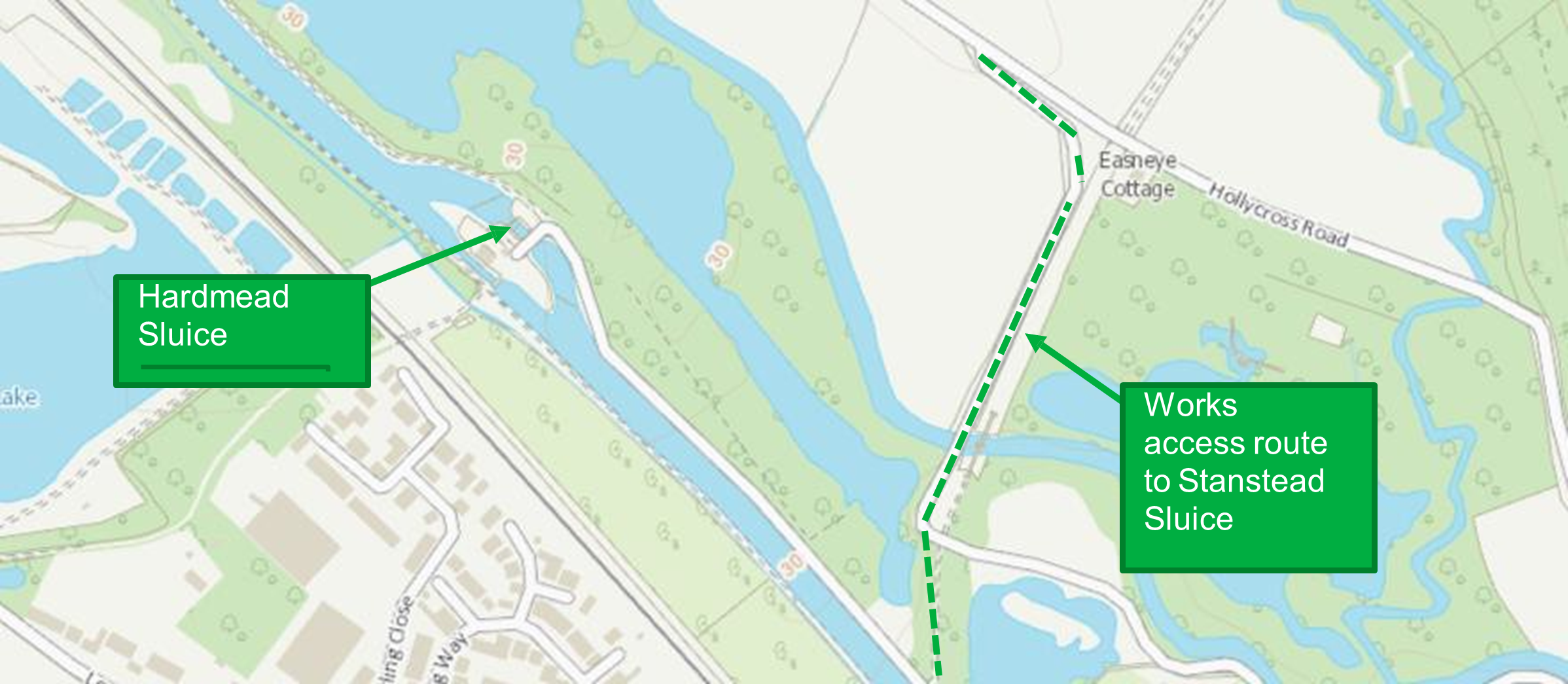 We will need to continue to have construction traffic use the track from Holycross Road as the similar works to replace Stanstead Sluice have started and are expected to be complete in spring 2026.