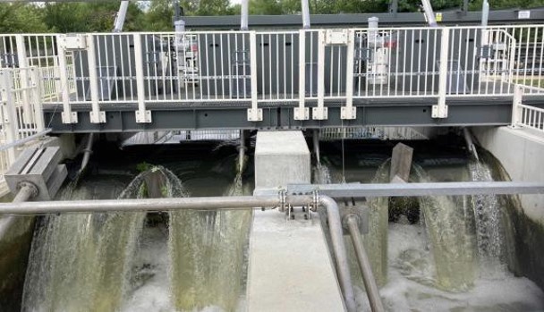 Above: New tilting weir gates with flow dividers to ensure air can get behind them, smoothing their movement. Pipework assists emptying a gate chamber for maintenance.