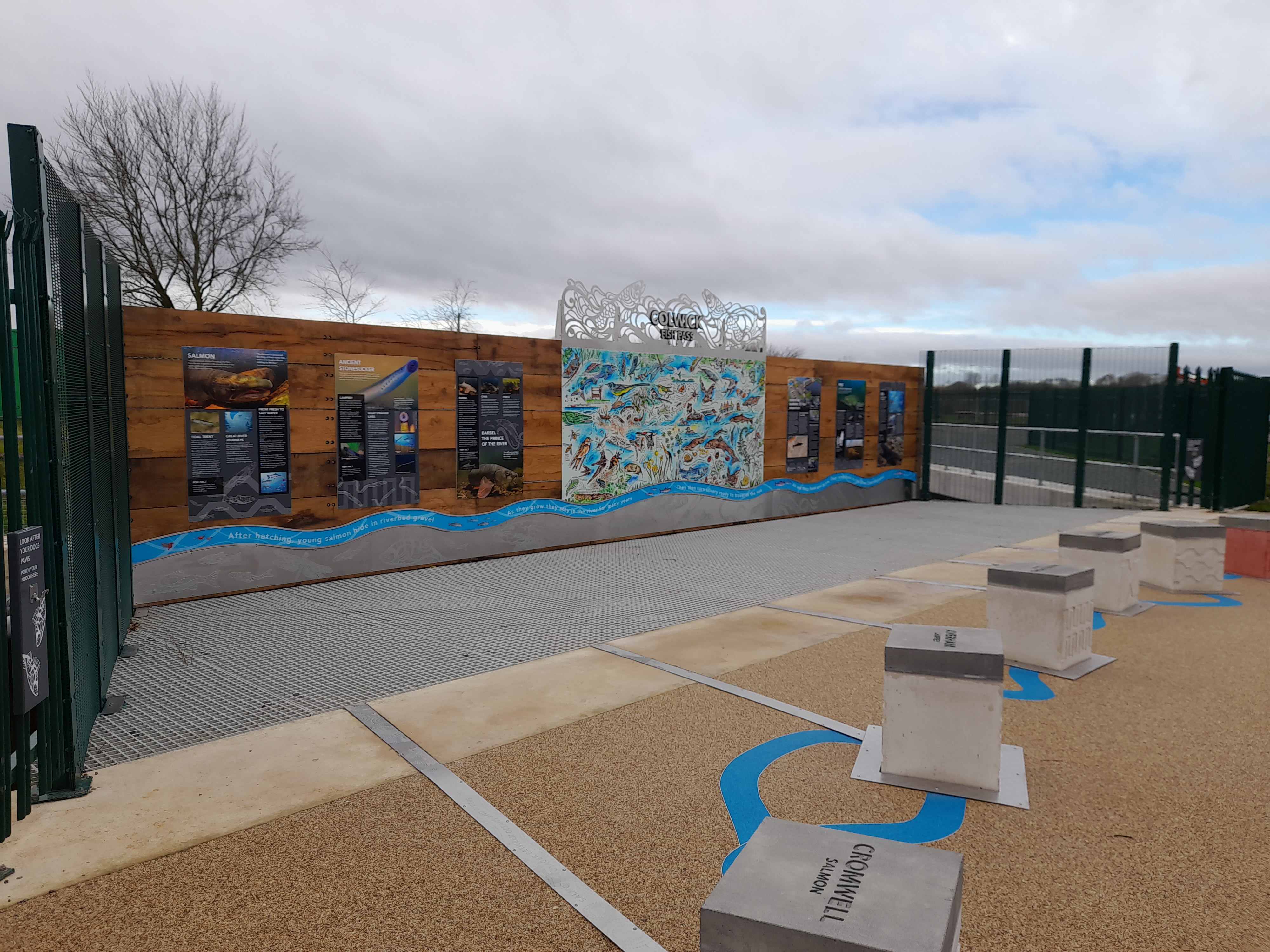 The public viewing platform is almost complete, with most of the signage installed. The viewing platform features detailed information boards on the likely species of fish and aquatic life which may frequent the pass, along with bespoke artwork from environmental artist Steve Pardue illustrating the wider ecosystem associated with the River Trent.