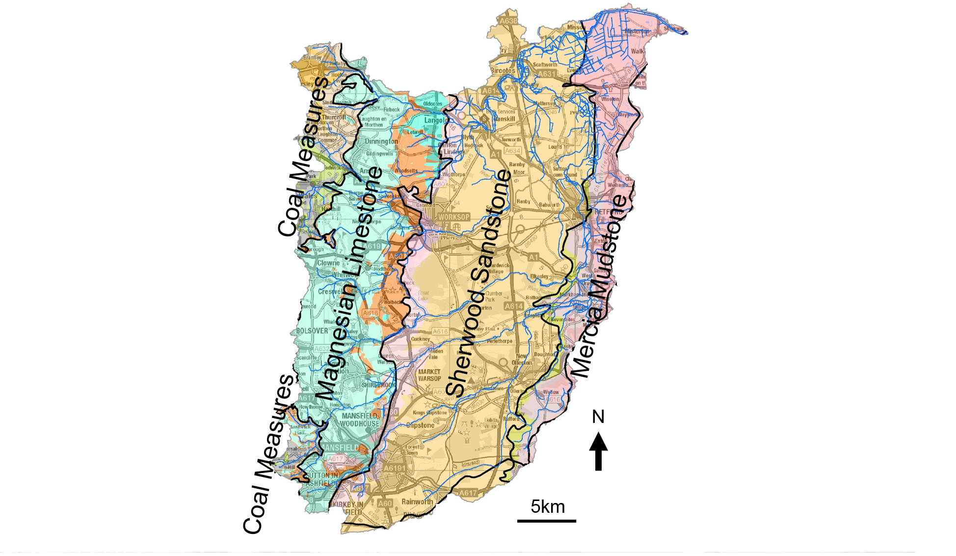 From west to east, the River Idle catchment is underlain by the following outcropping aquifers: the Coal Measures, Magnesian Limestone, Sherwood Sandstone, and Mercia Mudstone. These aquifers regionally extend at the surface in a north-south band fashion and dip slightly eastwards where they become confined beneath the overlying geology (Fig. 2). Additionally, where present, river sands and gravels Superficial Deposits provide a local but limited source of groundwater and in some areas may be hydraulically connected to the underlying aquifer.