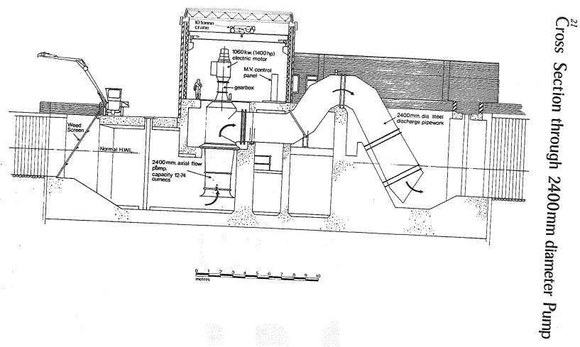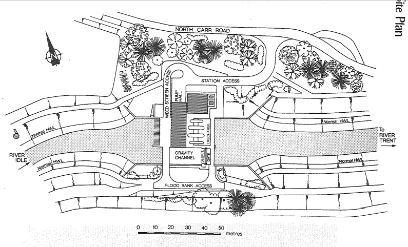 The majority of the land in this area lies below the Trent high tide level and because of this it relies on efficient drainage to support a high standard of agriculture. Since the early 1600's, works of reclamation and land drainage improvement have been a continuing process. The outflow into the River Trent is controlled by a pumping station and two sluices. A vertical sluice gate protects the entrance to the Idle, and the pumping station and another sluice are situated further back. When the water level in the Trent is low, the sluice gates allow water to leave the Idle by gravity, but at high tide during a flood event, four electric pumps are used to pump the outflow into the space between the sluice gates until it can again discharge by gravity. The pumping station was commissioned in 1981, and was the largest all-electric pumping station in Britain at the time. When all four pumps are operating, it can discharge 2,124 tons per minute.