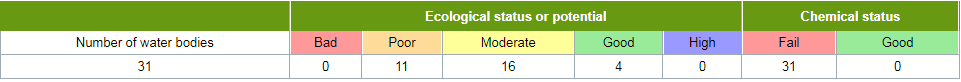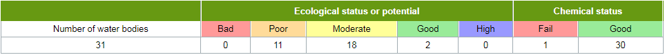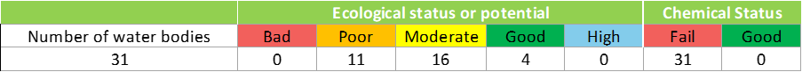 The increase in the number of water bodies failing the chemical status assessment after 2016 is due to a change in the assessment process rather than actual changes in water quality. Due to these changes, all water bodies now fail chemical status, and this assessment is not comparable to previous years assessments.
