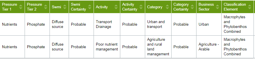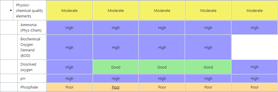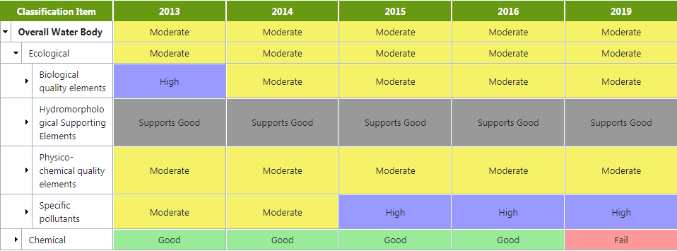 In individual water bodies numerous ecological, chemical, hydrological and morphological ‘elements’ are assessed to determine the overall water body status. Tables 3 -5 show an example of a water body assessment.