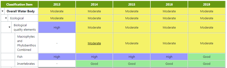 The overall water body classification (moderate) is determined using a principal known as ‘one out all out’. With this principal the lowest ‘element’ classification determines the overall classification. In this example ecological classification is moderate because the macrophyte / phytobenthos (plants and algae) ‘element’ is classified as being moderate even though fish and invertebrates (aquatic insects) are classified as being high or good.