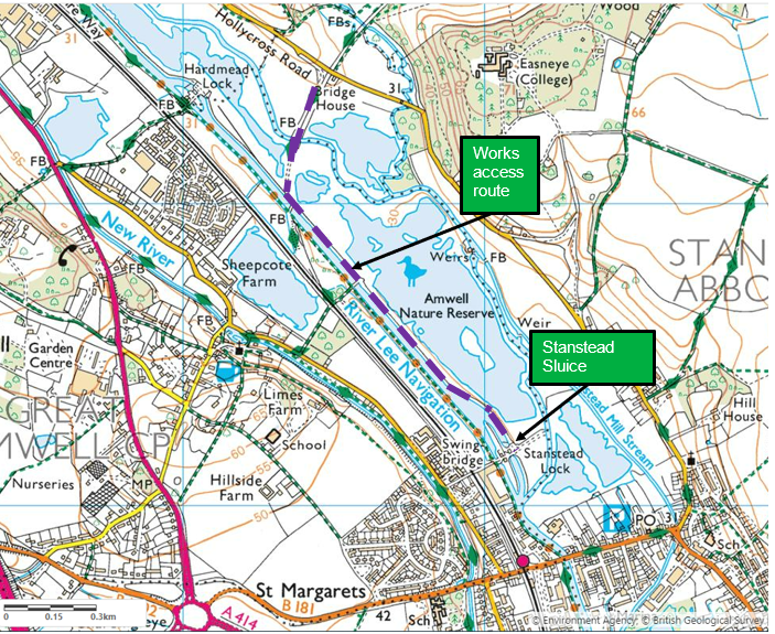 Construction vehicles will enter the site using the access track from Hollycross Road, and then along the riverside trackway towards Stanstead Sluice. Unrestricted access will be required at all times.